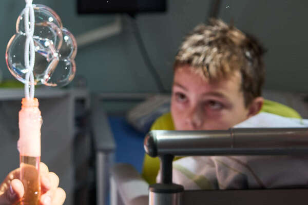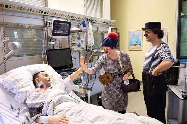 Ukulele, Spirale und los! Heute begleitet ROTE NASEN Clown Zazou den 9-jährigen Tariq*, der am Magen operiert werden muss.