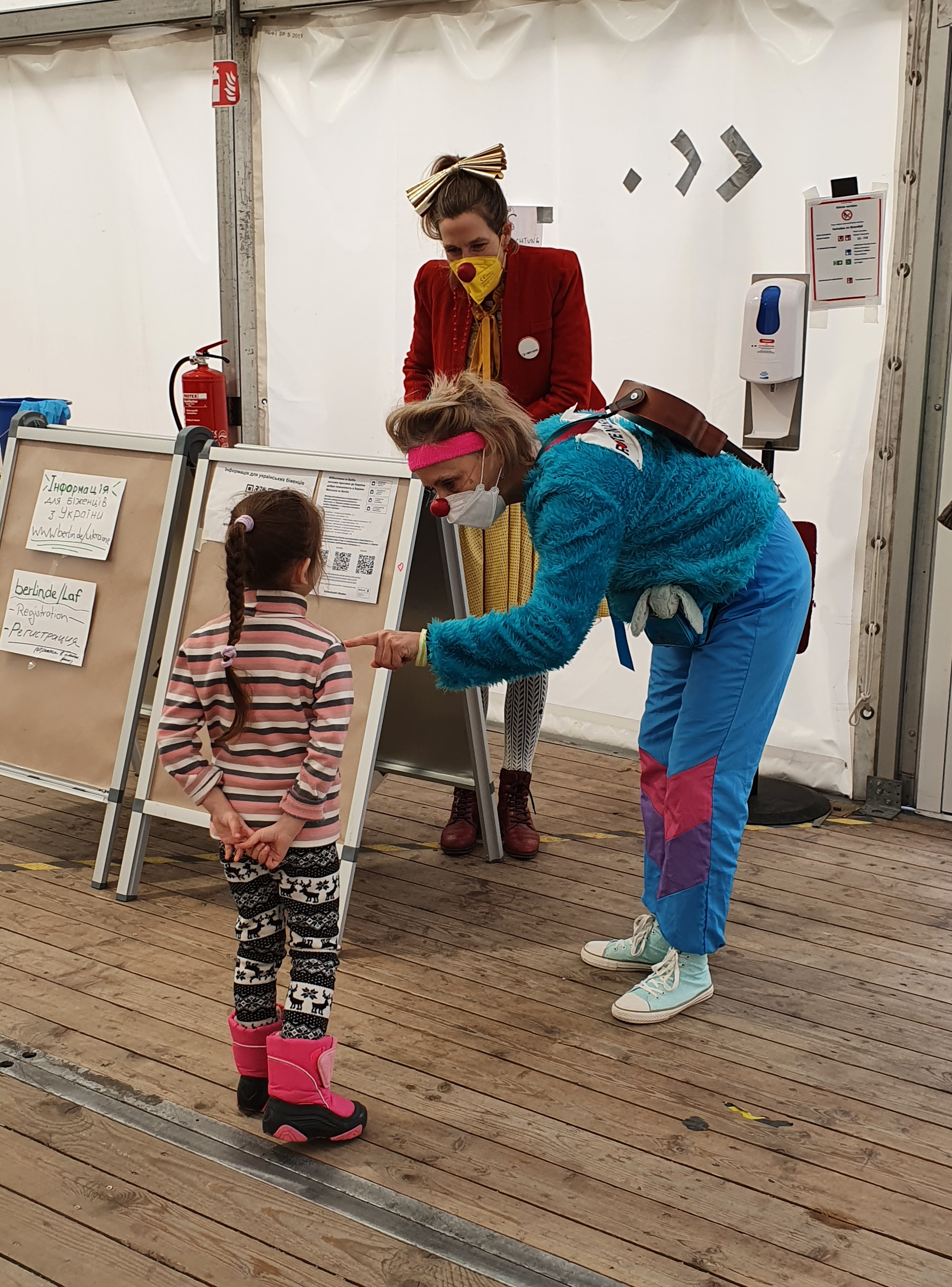 Unbeschwerte Momente für geflüchtete Kinder und ihre Familien aus der Ukraine – dafür sorgten jeden Tag ROTE NASEN Clowns im Ankunftszelt der Berliner Stadtmission am Hauptbahnhof in Berlin. Initiiert durch den Verein „Freiwillige helfen“ waren ab dem 18. März 2022 bis August jeweils zwei Künstlerinnen und Künstler vor Ort und luden die Kinder zum Spiel ein. Denn auch in der Not sollen Kinder Kind sein dürfen.