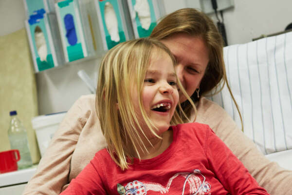 Die kleine krebskranke Elisa* zeigt unseren Clowns, wie sie Farben fühlen kann.