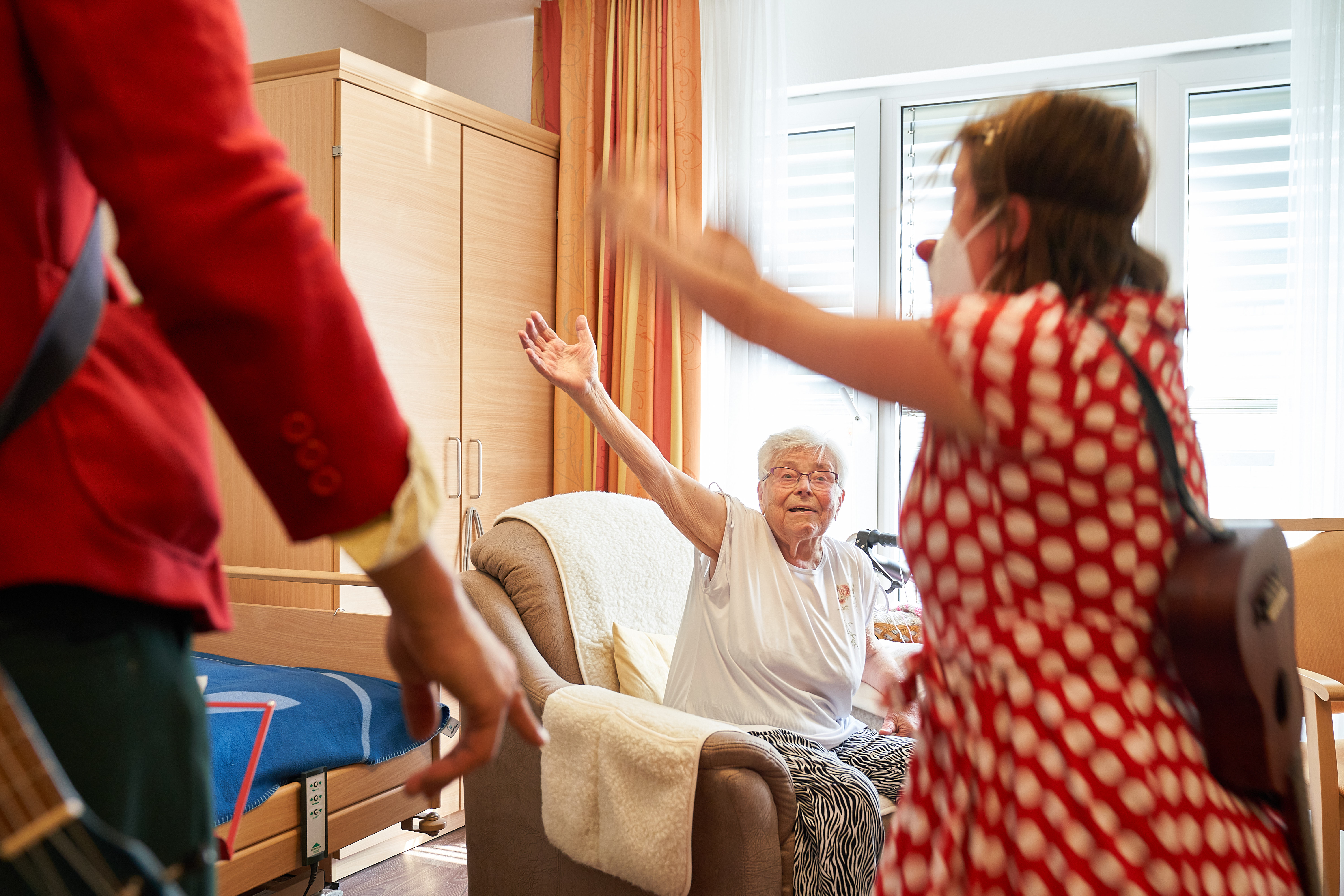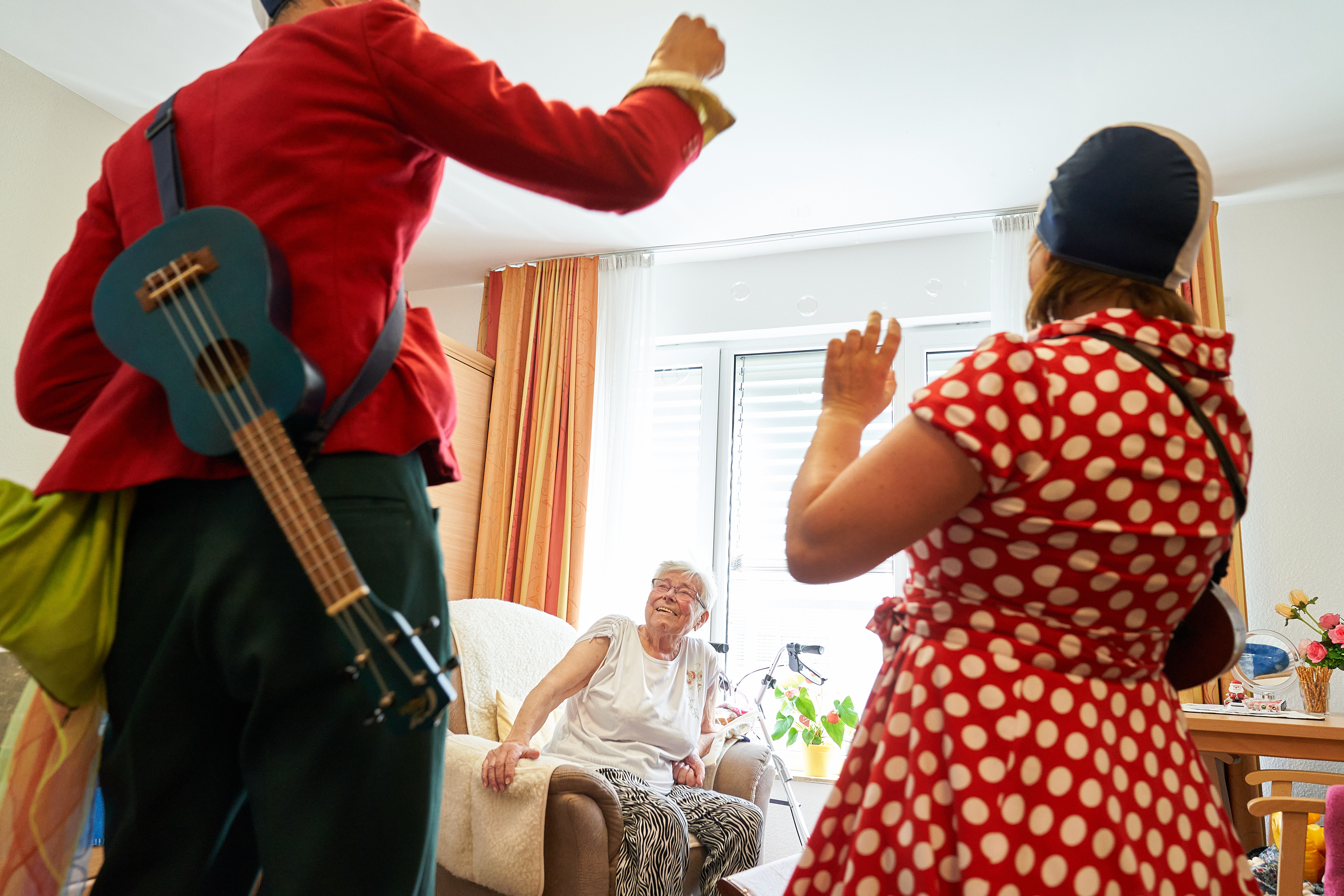 Gogo und Stefanello haben heute Schnuffi dabei, einen Plüschhund als Handpuppe. Wie erwartet freuen sich die meisten Bewohner:innen des Pflegeheims in Berlin über ihn. Sie rätseln mit den Clowns, ob es sich bei Schnuffi um ein Männchen oder ein Weibchen handelt. Frau Kreise* meint sogar immer, er sei transgender. Die zwei Clowns freuen sich auf Frau Breuner* ganz besonders. Sie lacht immer so schön, wie ein Glockenspiel. Ihr Lachen erklingt schon, wenn Stefanello wie immer Probleme hat, durch die Tür ins Zimmer zu kommen. Auch Schnuffi betrachtet sie wohlwollend. Auf ihrem Nachttisch steht ein digitaler Rahmen. Plötzlich erscheint dort ein Hund und verschwindet wieder. Stefanello wundert sich, wo er denn hingeflogen sei. „Kannst du auch fliegen, Schnuffi?“, fragt er seinen Hundefreund. Und tatsächlich - Schnuffi hebt ab! Gogo staunt: „Ein Flughund. Ich dachte das können nur Fledermäuse und nicht Yorkshire Terrier wie Schnuffi!“