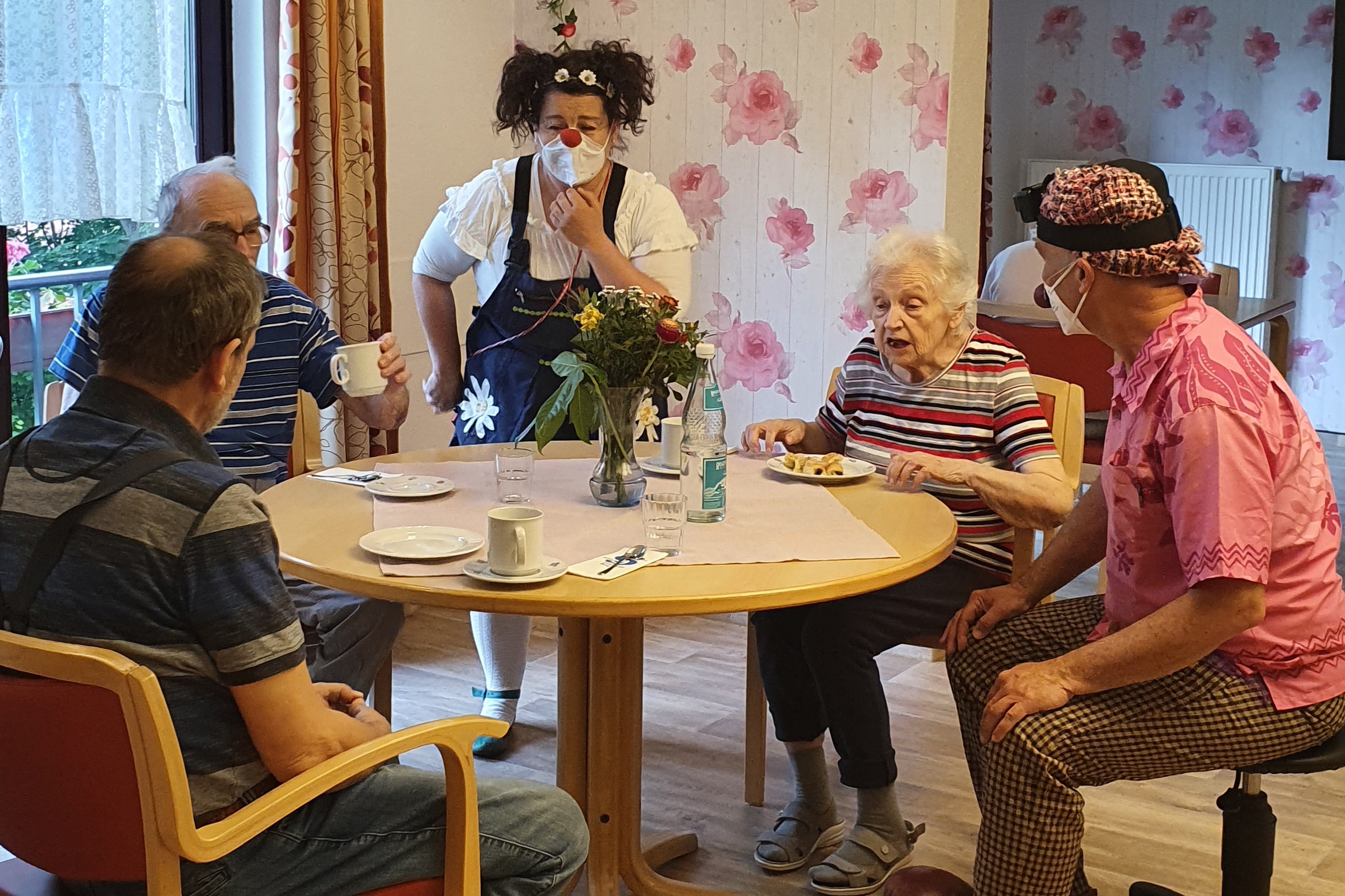 Pünktlich um halb drei gibt es Kaffee und Kuchen für die Bewohnerinnen und Bewohner. Wie jeden Mittwoch sind auch heute Margarita und Stefanello zum Kaffeeklatsch eingeladen. Schon auf dem Flur treffen die beiden einige Bewohnerinnen. Unter ihnen auch Frau Spitz*. Sobald die ältere Dame die zwei Clowns in den farbenfrohen Kostümen wahrnimmt, geht sie mit leuchtenden Augen auf sie zu. Gemeinsam stimmen sie „Ich tanze mit dir in den Himmel hinein“ an, einen Hit von Willy Fritsch & Lilian Harvey aus den 40er Jahren und schunkeln im Takt. Ein musikalisches Intermezzo vor dem Kaffeeklatsch schadet nie! Dann gibt es aber auch schon den Kaffee mit Schokokuchen und Blätterteiggebäck.
