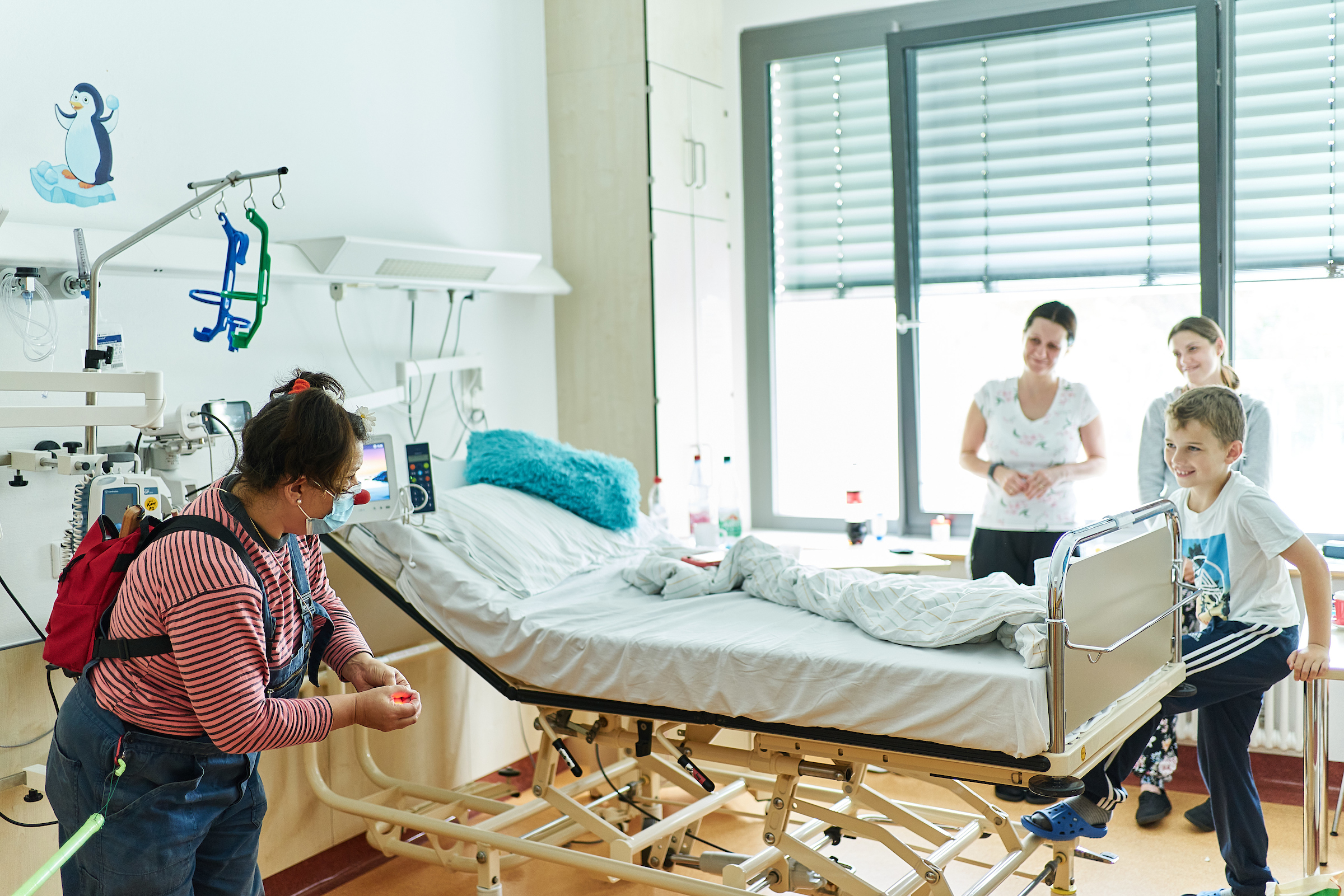 Stefanello und Emma-Dilemma sind auf dem Weg zum elfjährigen herzkranken Max*, der auf der Station der Kinderkardiologie liegt. Clown Emma-Dilemma freut sich besonders. Letzte Woche noch besuchte sie Max auf Wunsch einer Krankenschwester auf der Intensivstation. Heute geht es Max schon besser, er ist nicht mehr ganz so blass.