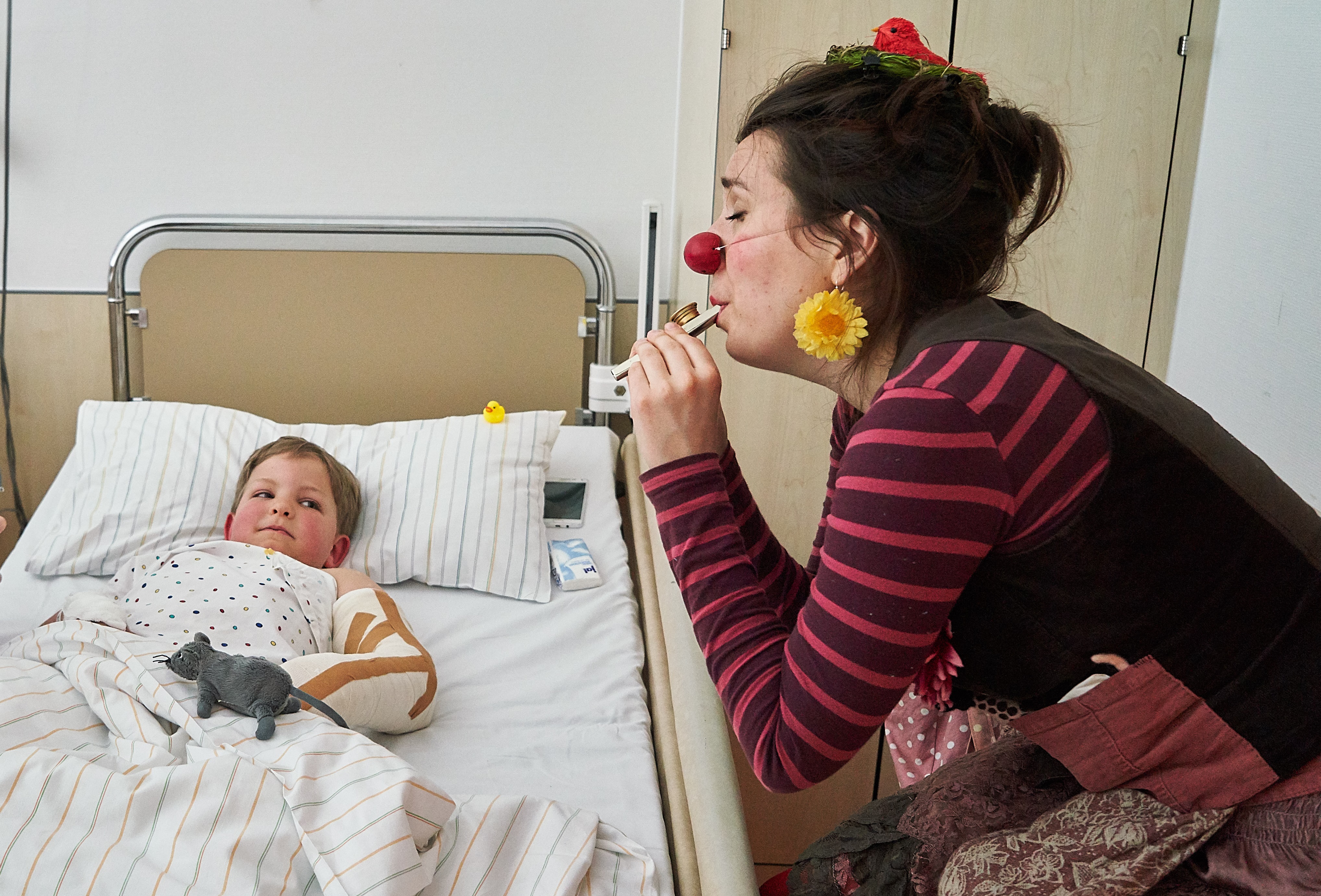 ROTE NASEN Clown Natascha Lachmannova ist mal wieder im Deutschen Herzzentrum unterwegs. Sie klopft an eine Zimmertür, aber es antwortet keiner. Sie klopft erneut und hält ihren Kopf lauschend an die Tür. Siehe da! Jemand spricht laut und schnell und man hört Musik im Hintergrund. Natascha fasst sich ans Herz und betritt das Zimmer. Der kleine Finn* (8 Jahre) liegt da ganz allein in seinem Bett, die anderen Betten sind leer.