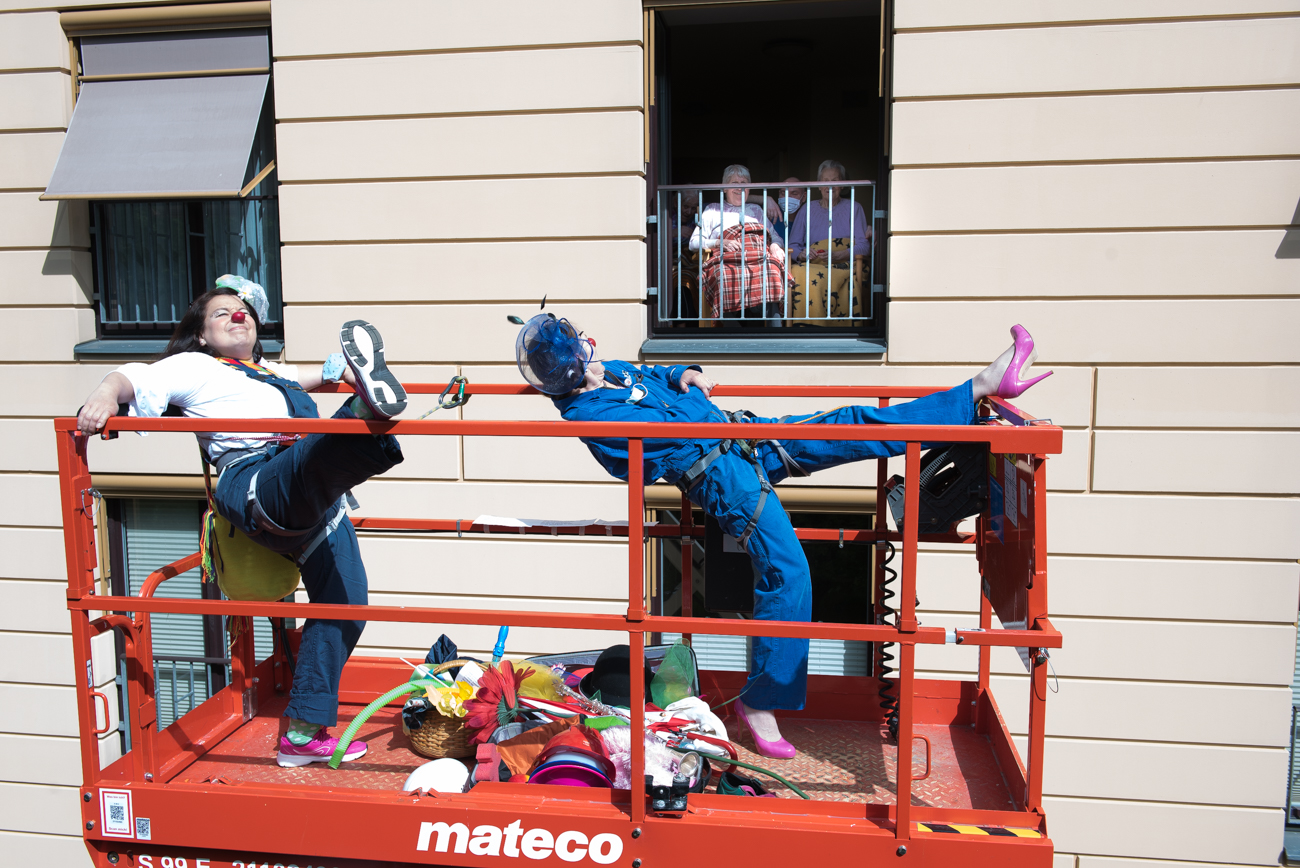 So etwas hat man im Haus Stavangerstraße der Seniorenstiftung Prenzlauer Berg auch noch nicht gesehen! Getreu dem Motto "Wenn der Clown nicht in die Einrichtung kann, kommt er eben ans Fenster geschwebt", ließen sich die Künstlerinnen Sybille Ugé alias Clown Flotte Lotte und Ligia Liberatoria (Clown Margarita) vor die Fenster und Balkone im zweiten Stock der Einrichtung heben. Zum Glück sind die beiden schwindelfrei, denn die 2,50 Meter breite Hebebühne schwebte in zehn Metern Höhe.