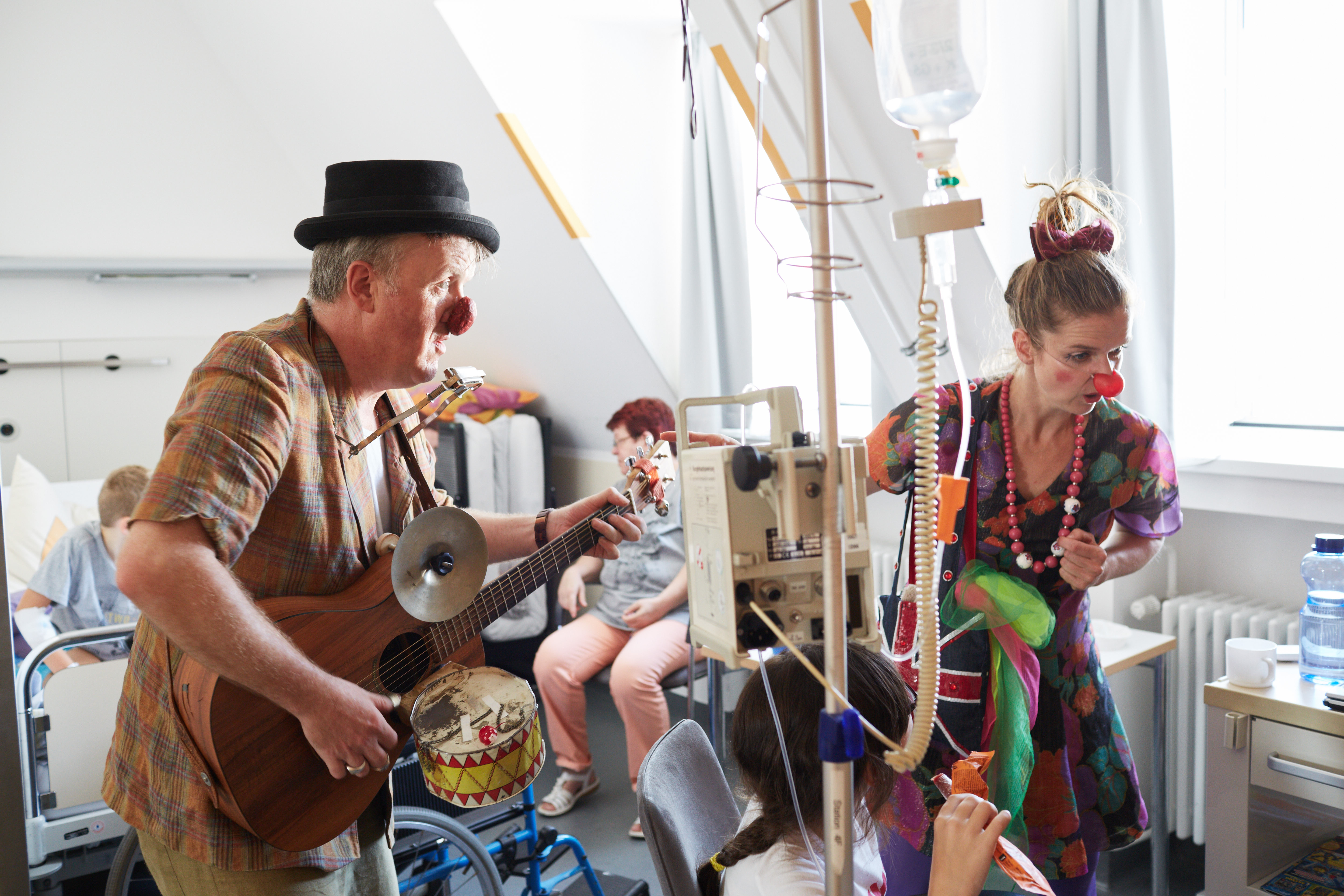 „Hallo, ich bin Perdita Poppers und das ist mein Freund Musto“, sagt Perdita und zeigt dabei auf ihren Clown-Kollegen, der neben ihr hockt. „Und wer bist du?“ Alina antwortet zurückhaltend: „Ich heiße Alina.“ „Hallo Alina“, entgegnet Musto. „Darf ich dir eine Geschichte erzählen?“ Doch sobald Musto seine Geschichte mit ‚Es war einmal‘ anfängt, piept die Maschine neben dem Bett plötzlich ganz laut. Musto erschreckt sich: „Was war das?“ Das Messgerät piept erneut. „Wo kommt das her?“, wundern sich die Clowns. Alina schmunzelt. „Na ja, egal. Ich wollte dir ja eine schöne Gesch…“, „Piep, Piep, Piep“ macht die Maschine wieder. „Also langsam wird mir das sehr komisch hier. Ich kann dir ja nicht mal in Ruhe meine Geschichte erzählen“, ärgert sich Musto. „Piep, Piep, Piep.“ Immer wieder unterbricht ihn die Maschine. Alina findet das allerdings sehr lustig.