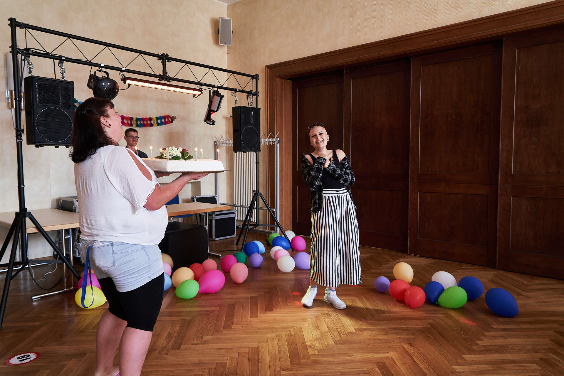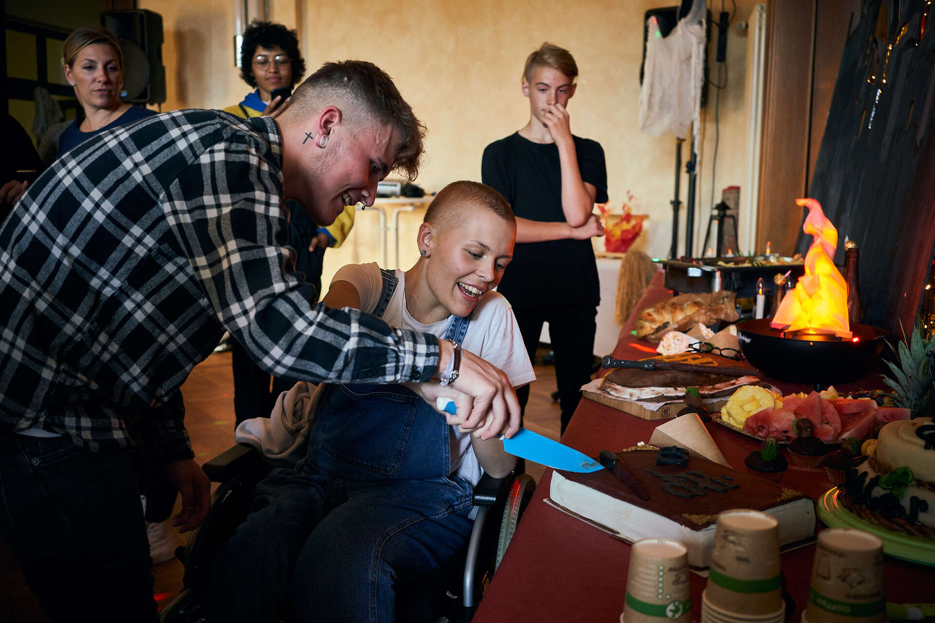 Enlarge photoDamian und Michelle sind zum Zeitpunkt der Abschiedsfeier seit sechs Monaten ein Paar. Zusammen schneiden sie die Harry Potter - Torte an. Der neunzehnjährige Damian steht Michelle im Kampf gegen den Krebs zur Seite.