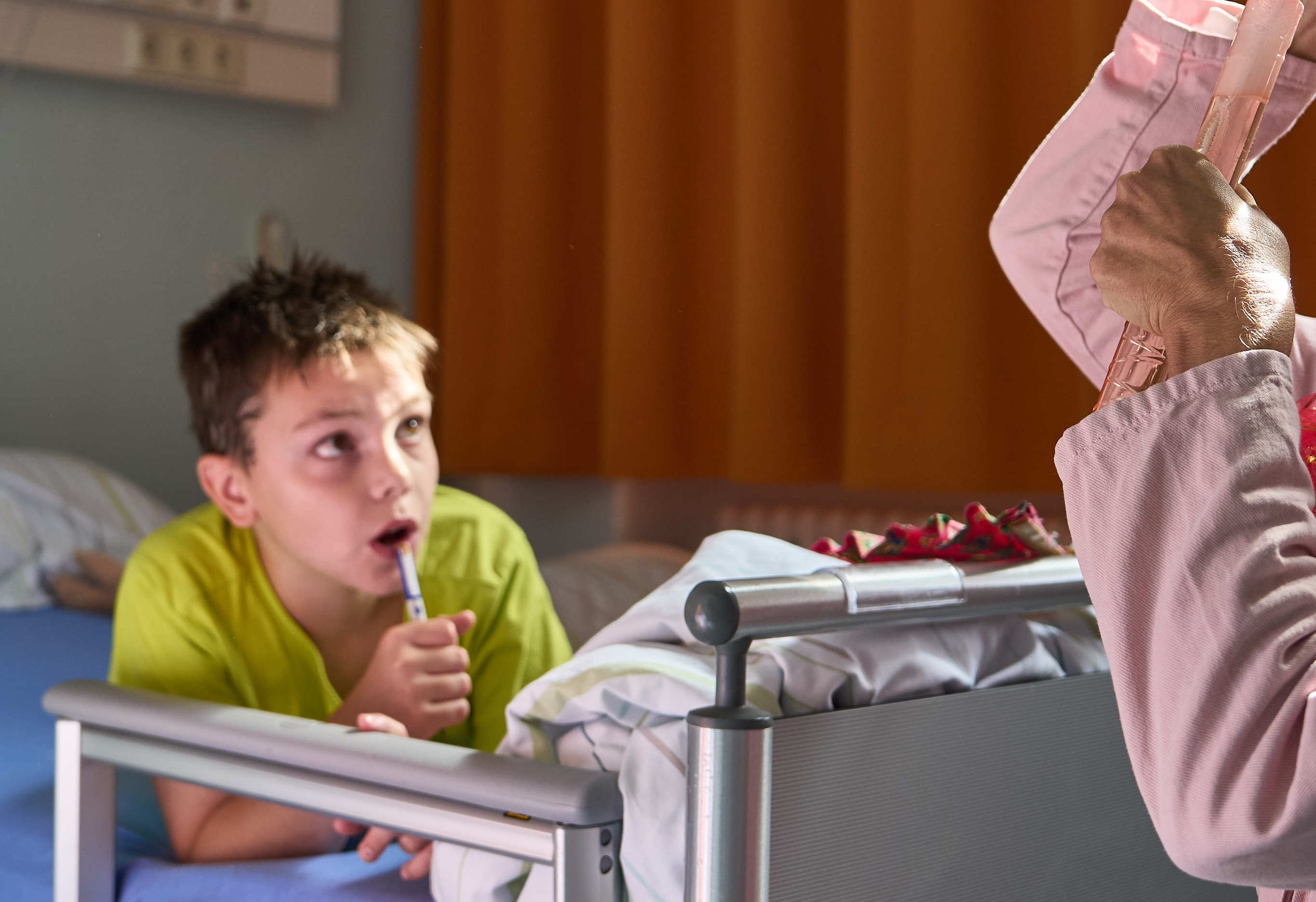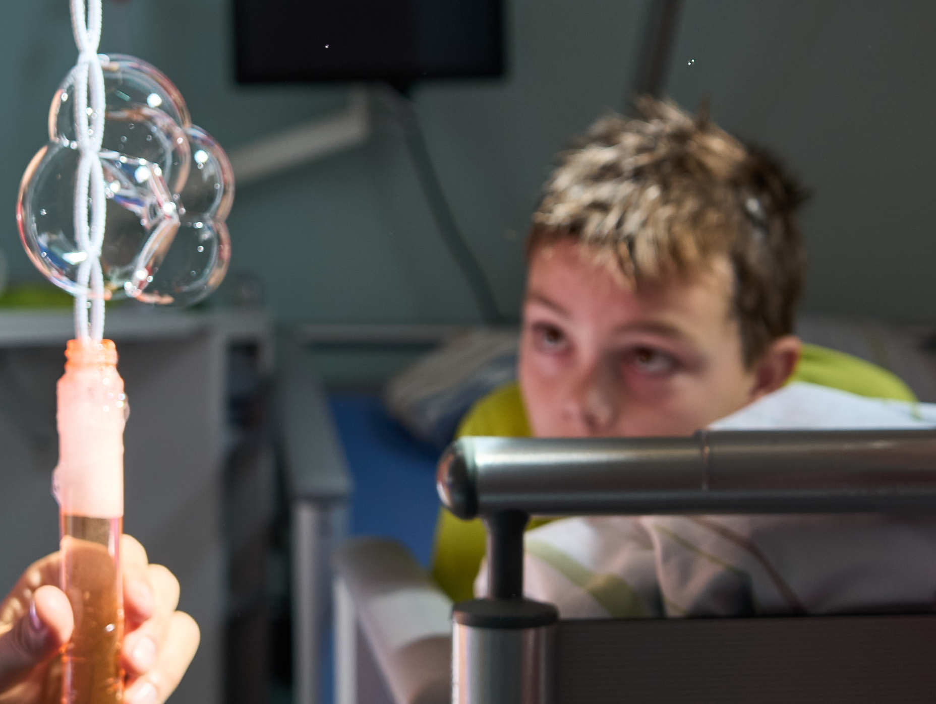 Enlarge photoDer Weg zum OP-Saal führte durch einen Aufwachraum, in dem viele andere Kinder waren. Die Stimmung dort war entspannt und spielerisch. Als Tariq immer weiter in die Schleuse vor den OP-Raum kam, sah man die Panik in seinen Augen. Er öffnete seine großen, braunen Augen weit, verzog den Mund und versuchte immer wieder, aus dem Bett zu klettern. Er war nicht zu beruhigen, was alle Beteiligten in der Schleuse und im Aufwachraum sehr herausforderte. Eine der OP-Pflegerinnen hatte dann eine Idee: Per Handzeichen sagte sie zu Tariqs Vater Bilal: „Nehmen Sie Ihr Kind in den Arm und gehen Sie erst einmal raus.“