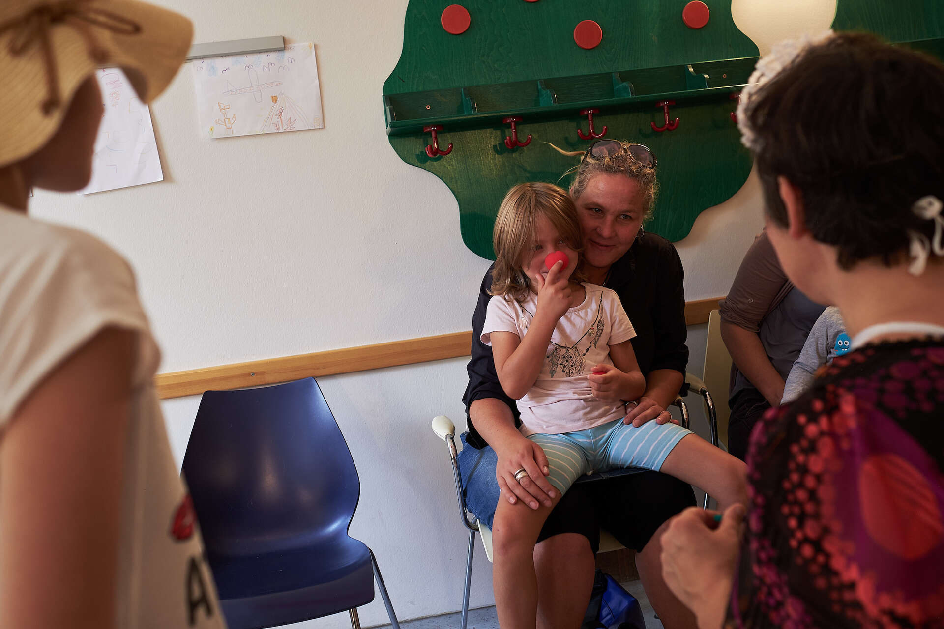 Wir sind auch für die Eltern da. Auf der Isolationsstation der Kinderonkologie, dort, wo die Kinder eine Stammzellentransplantation hinter sich haben, sitzen manchmal Mütter und Väter in einer Art Ruheecke am Ende des Flurs. Auf der Station ist kein Platz für Gefühle, die Eltern sind rundum mit der Betreuung ihrer Kinder beschäftigt, sie müssen einfach funktionieren. Ich erinnere mich, wie meine Clownpartnerin und ich an Eltern, die dort in der Ecke saßen, vorbeigingen und Witze machten. Eine Mutter trank gerade etwas und da musste sie so lachen, dass sie das ganze Wasser verschüttete. Das war ein schöner, lebendiger Moment.
