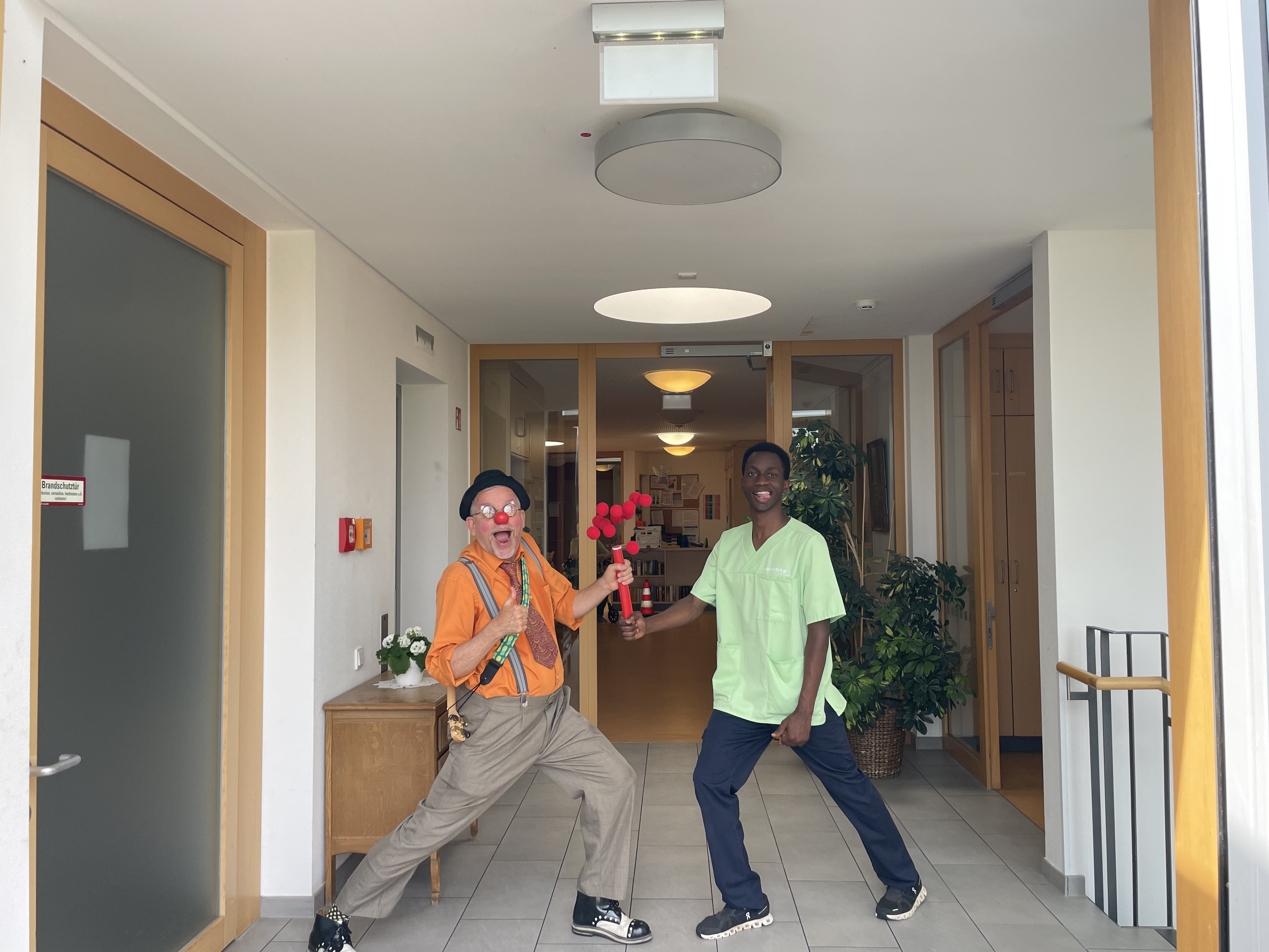 Vom Bodensee geht der ROTE NASEN Staffellauf schon langsam wieder Richtung Norden, nämlich nach Nufringen bei Stuttgart. Mit ingesamt zwölf Nasen ausgestattet wird er mit den Clowns regelrecht durch die gesamte Einrichtung gereicht: von sportlichen Besuchern am Haupteingang, über Bewohnerinnen und Bewohner in Aufenthaltsräumen, über Pflegekräfte beim Empfang, bis hin in den Garten zum Hausmeister, der gerade den Rasen mäht. So erreicht das Lachen wirklich jeden Menschen und jede Ecke im Samariterstift in Nufringen.