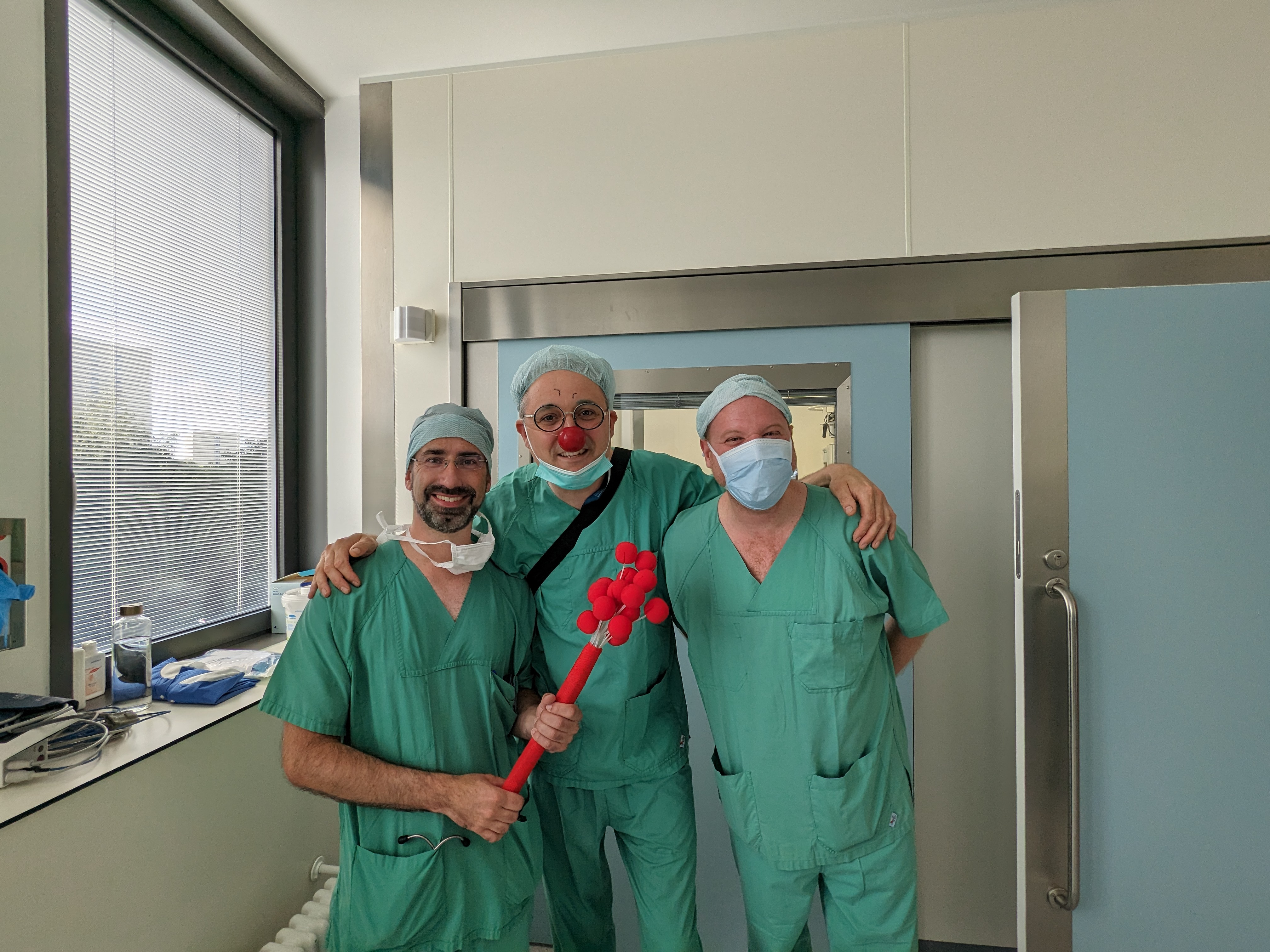 Der nächste Halt des Staffellaufs führt unsere ROTE NASEN Clowns in das Ernst von Bergmann Klinikum im Herzen Potsdams. Hier haben die aller ersten OP-Begleitungen stattgefunden. Der rote Staffelstab wird stellvertretend dem leitenden Oberarzt Erik Zedler übergeben. Dafür besuchen wir ihn im OP, wo sich die Clowns üblicherweise von den Kindern verabschieden und sie in die fähigen Hände des Klinikpersonals übergeben.