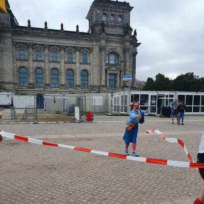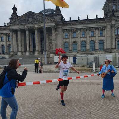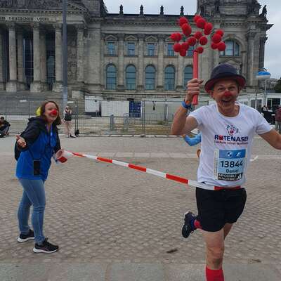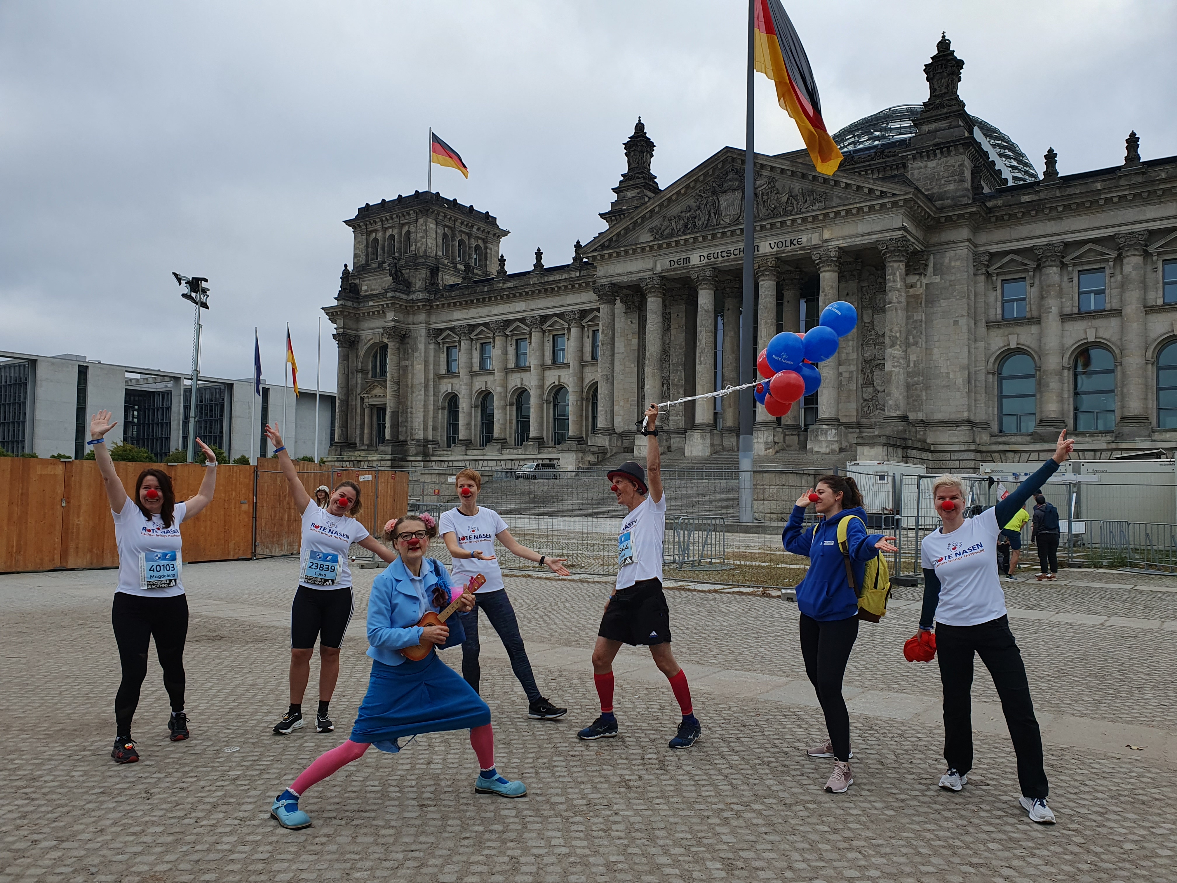 Nach dem Startschuss im Mai in der Kinderklinik der Berliner Charité hat der "Lachel-Stab" pünktlich zum BMW BERLIN-MARATHON am 24. September seinen Weg zurück in die Hauptstadt gefunden und wurde von Clown Bartusch vor dem Berliner Reichstag symbolisch durch die Ziellinie getragen.