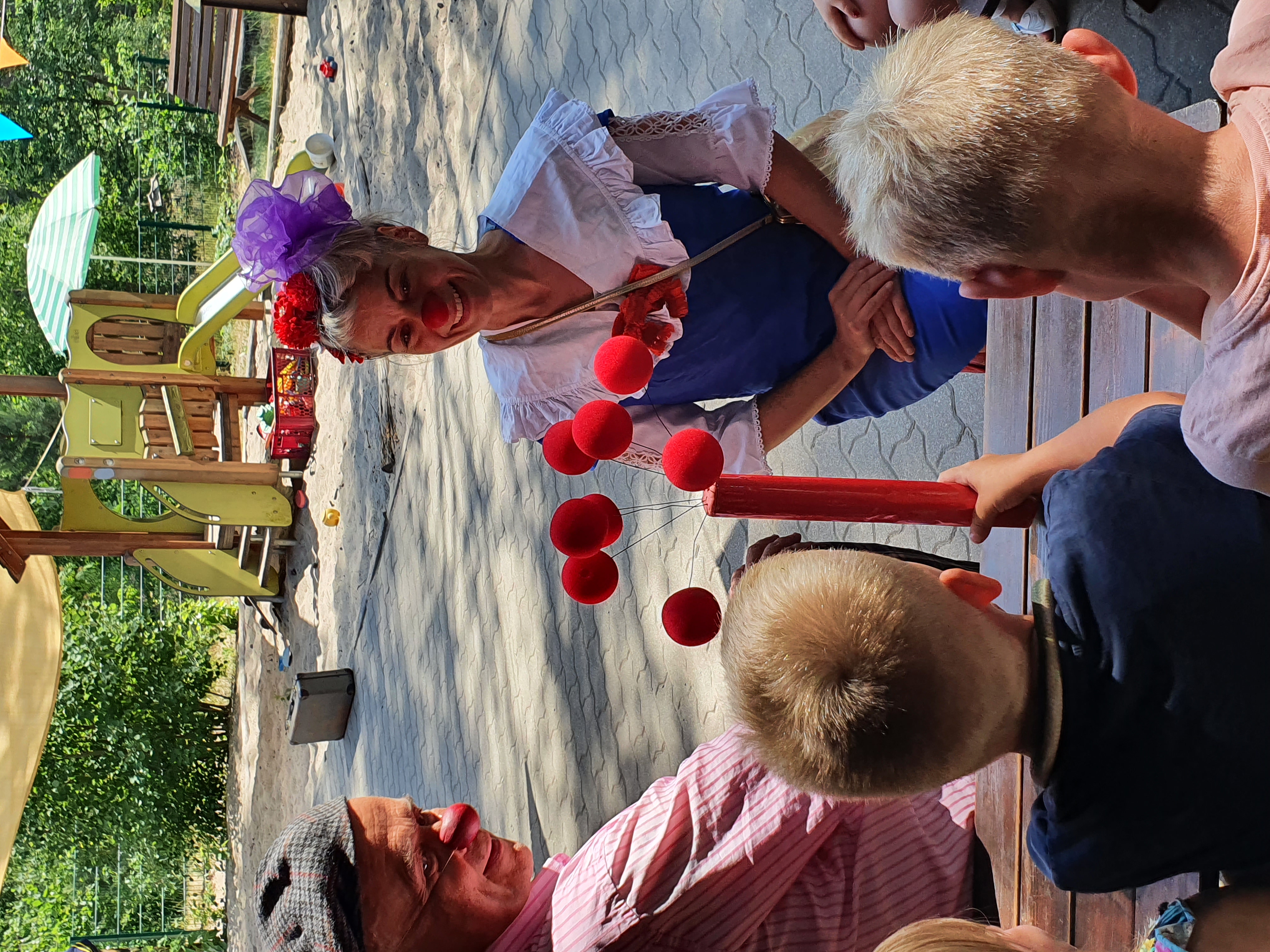 In Woche 8 geht es weiter mit dem Staffellauf in der psychosomatischen Fachklinik FONTANE-KLINIK in Mittenwalde. ROTE NASEN Clowns Friedel und Stefanello tragen den Staffelstab erstmal in die Eltern-Kind-Therapiegruppen, wo der Staffelstab von Stefanello zum Leben erweckt wird. Er flüsstert den Kindern zu, wo er überall war und die Kinder erzählen es nach: Der Lachel-Stab macht eine Reise durch die Alpen. Auf dem Weg trifft er das Regenbogen-Zweihorn und eine Ziege, die seine Hausaufgaben frisst. Zum Schluss fliegt er auf die Malediven, um dort ein Eis zu essen. Nachdem Henrik, Mia und Karla* gemeinsam mit den Clowns diese Fantasiereise durchleben, geben sie den Stab den Clowns wieder. Zur Krönung des Tages bekommen Stefanello und Friedel im Namen aller ROTE NASEN Clowns im Kindergarten der Klinik Geschenke und die Kinder dürfen sich alle vom Staffelstab etwas wünschen, bevor er wieder weiterreist.