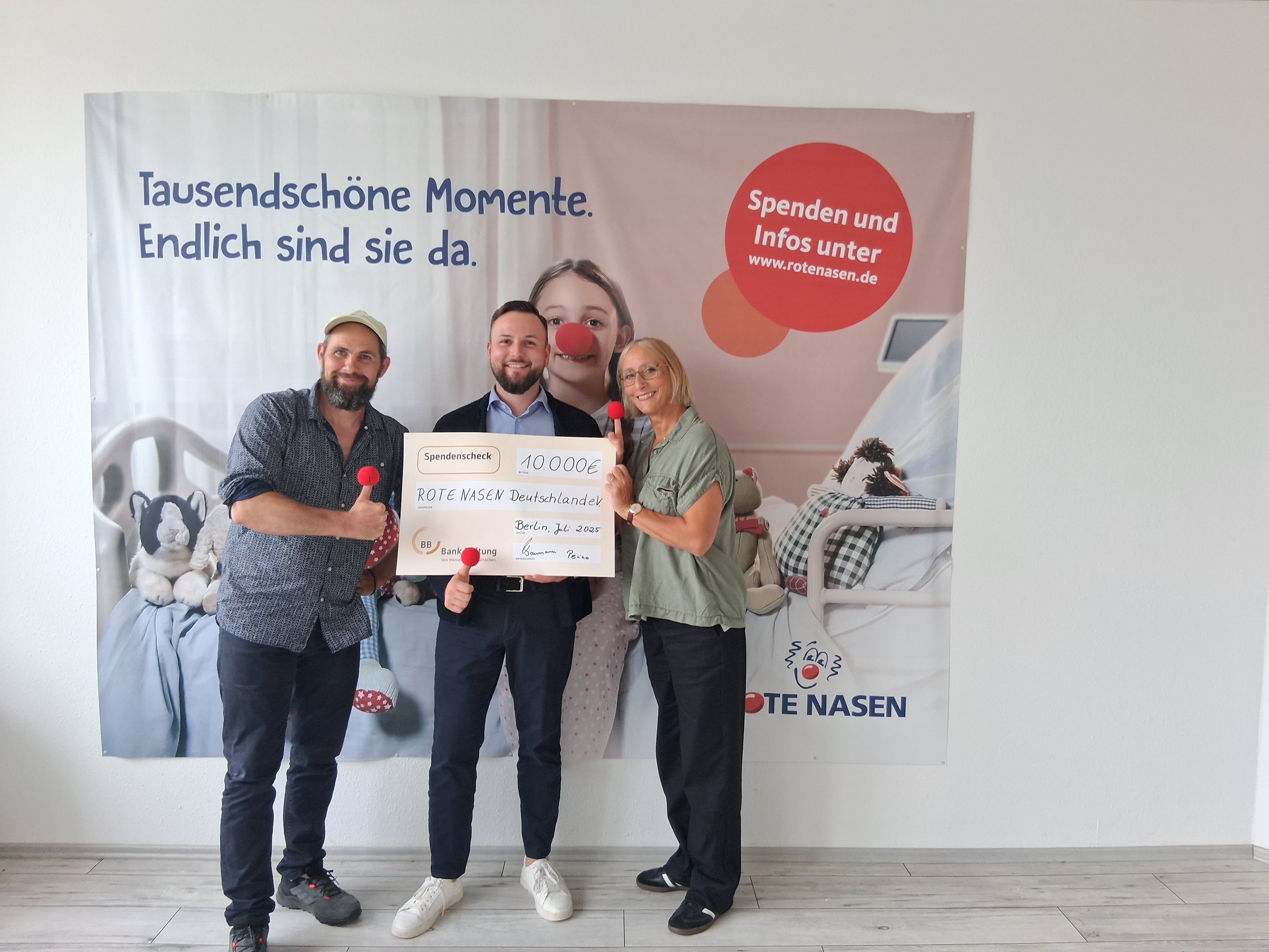 Wir bedanken uns herzlich bei der BBBank Stiftung für die großzügige Unterstützung unserer Clownvisiten auf der Kinderonkologie der Charité Universitätsmedizin Berlin. Am Freitag, 29.08.2025, fand in den Räumen von ROTE NASEN Deutschland e.V. zusammen mit Chris Erdmann von der BBBank eG (Regionalleiter Berlin-Brandenburg) die Scheckübergabe über 10.000 Euro statt.