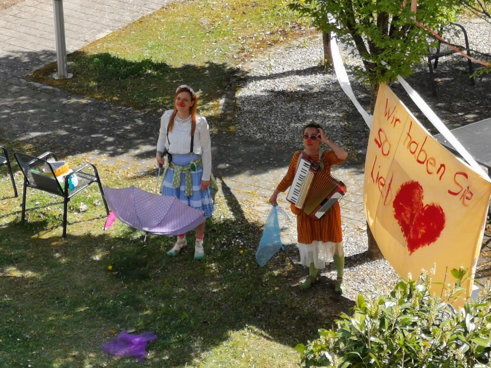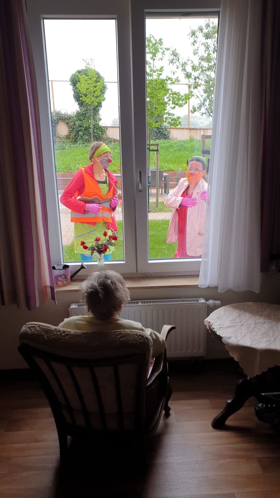 Enlarge photoROTE NASEN Clowns finden trotz Besuchsverbot Wege, um den Bewohnerinnen und Bewohnern von Pflegeeinrichtungen Hoffnung zu schenken. Bundesweit spielen unsere Künstlerinnen und Künstler in Gärten oder Höfen für Pflegebedürftige, die von den Fenstern oder Balkonen aus den Clowns zuschauen. So sieht es aus, wenn Garten oder Hof zur Bühne werden - wir zeigen eine Auswahl der ROTE NASEN Fenstervisiten: