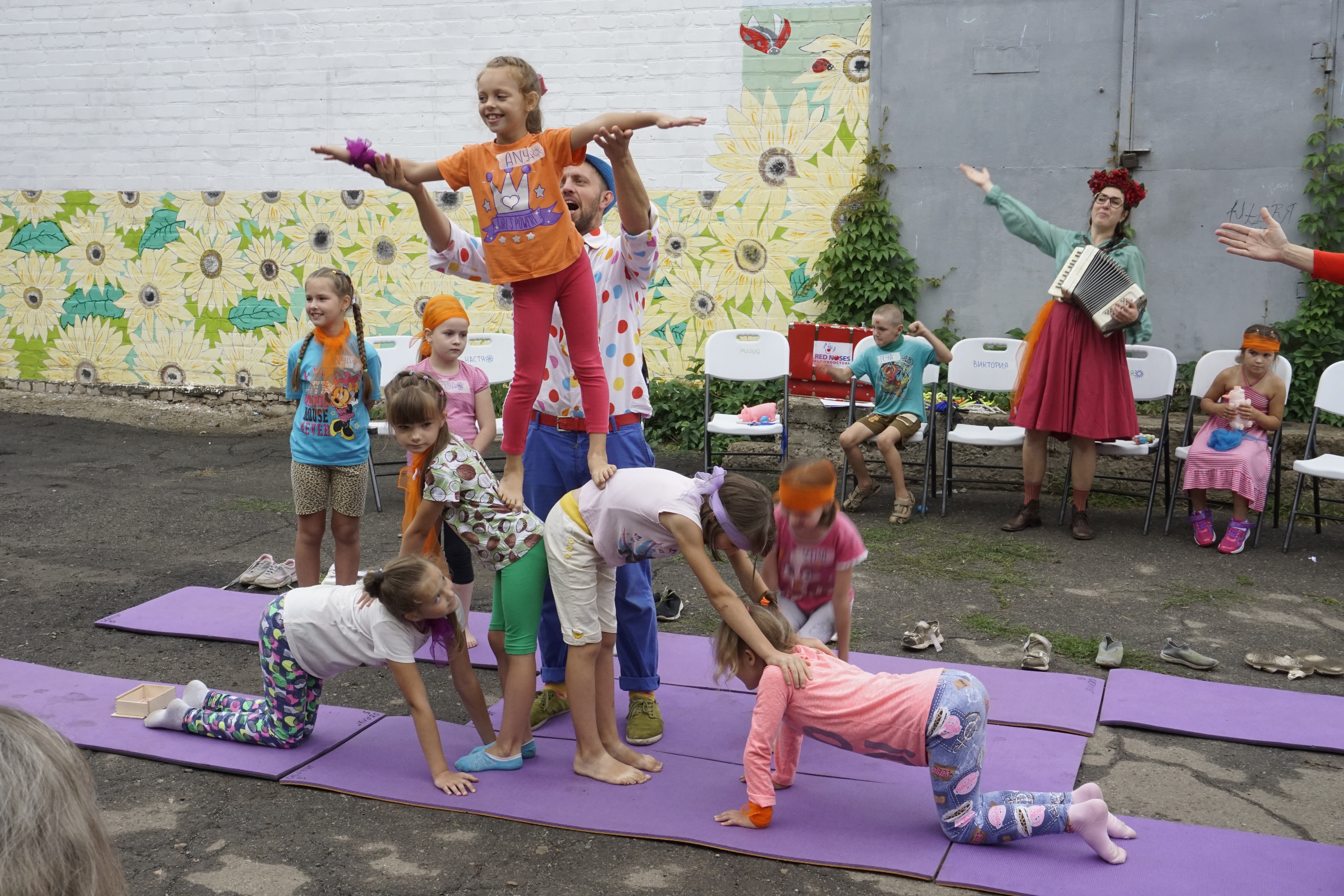 Im Rahmen der internationalen Emergency Smile Missionen weltweit haben wir in der Ukraine bereits Partnerorganisationen, mit denen wir regelmäßig zusammenarbeiten. Seit 2018 war unsere ROTE NASEN Künstlerin Polina Borissova (alias Clown Fenomena) mit internationalen Clownkolleginnen und -kollegen bereits drei Mal in der Ostukraine - das letzte Mal im vergangenen August nahe der sogenannten Kontaktlinie. Die Künstlerin erinnert sich an die vielen Porträts der gefallenen Soldaten an Wänden, die Einschusslöcher in vielen Gebäuden und die Angst, das Leid und die Unsicherheit der Menschen vor Ort. Das internationale Team aus fünf ROTE NASEN Clowns fing dort an, mit den Kindern Musik zu machen. Musik und Humor erschaffen einen geschützten Raum aus Leichtigkeit und Freude, in dem die Probleme und Ängste für den Moment verfliegen können.