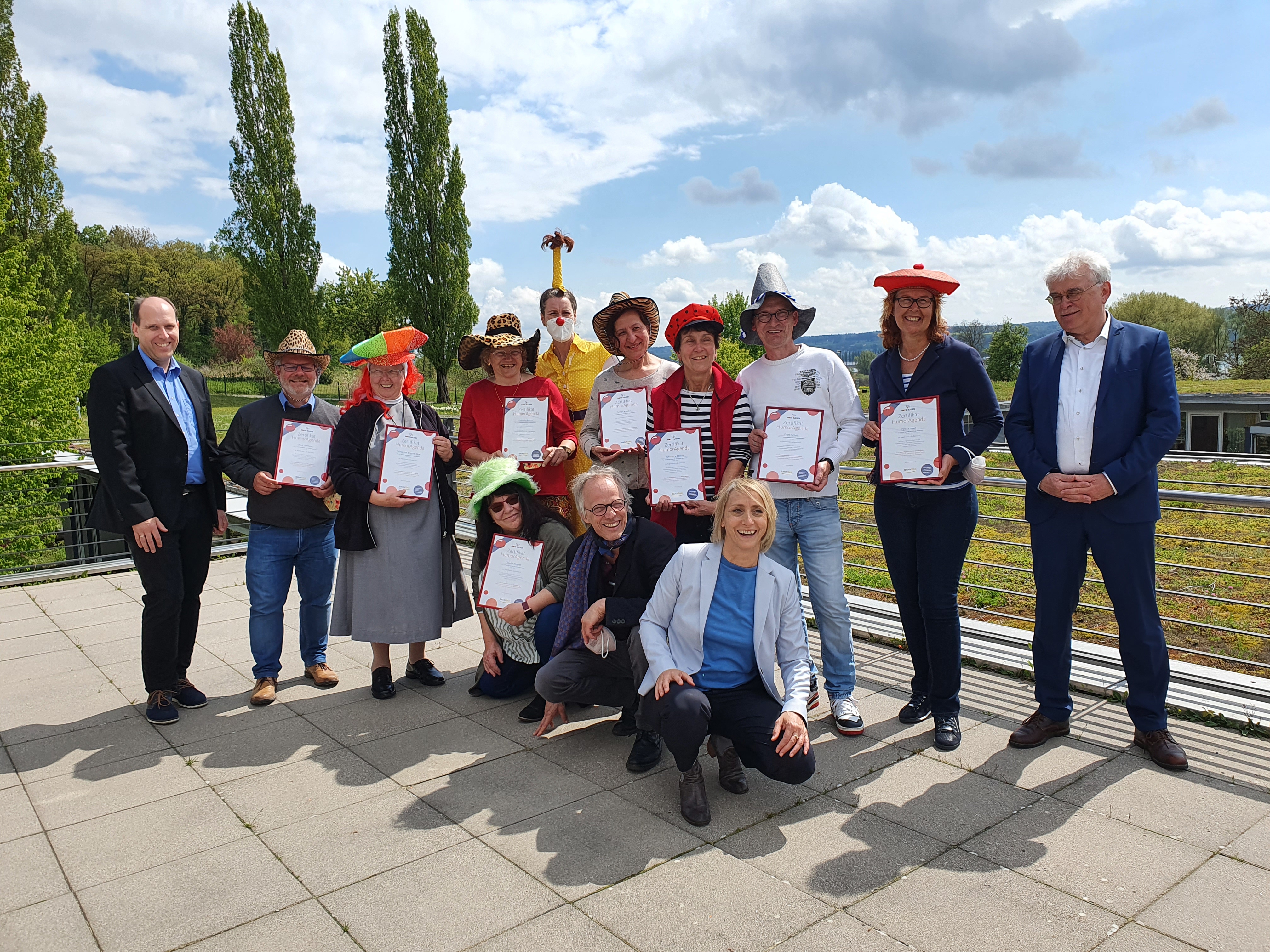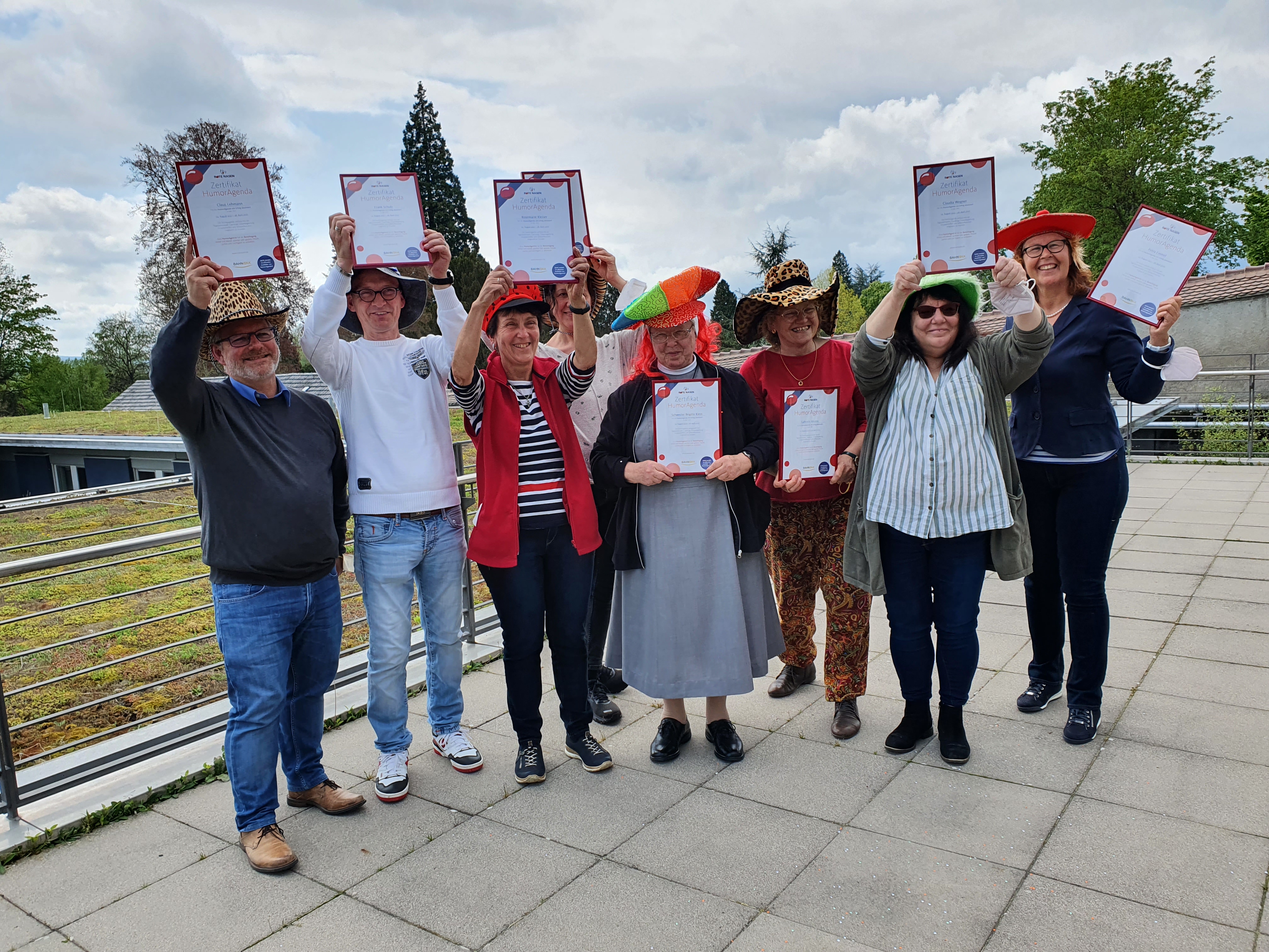 Am 26.4.2022 wurden neun Pflege- und Betreuungskräfte im Schwimmbadsaal des Altenpflegeheims Maria Hilf des Kloster Hegne mit einem Zertifikat zu ROTE NASEN HumorAgent:innen ausgezeichnet.