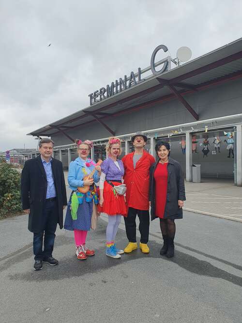Die Bezirksbürgermeisterin und ihr Stellvertreter von Reinickendorf (Emine Demirbüken-Wegner & Uwe Brockhausen) schauen sich ein Clownvisite im Ankunfts- und Notunterbringungseinrichtung Tegel an.