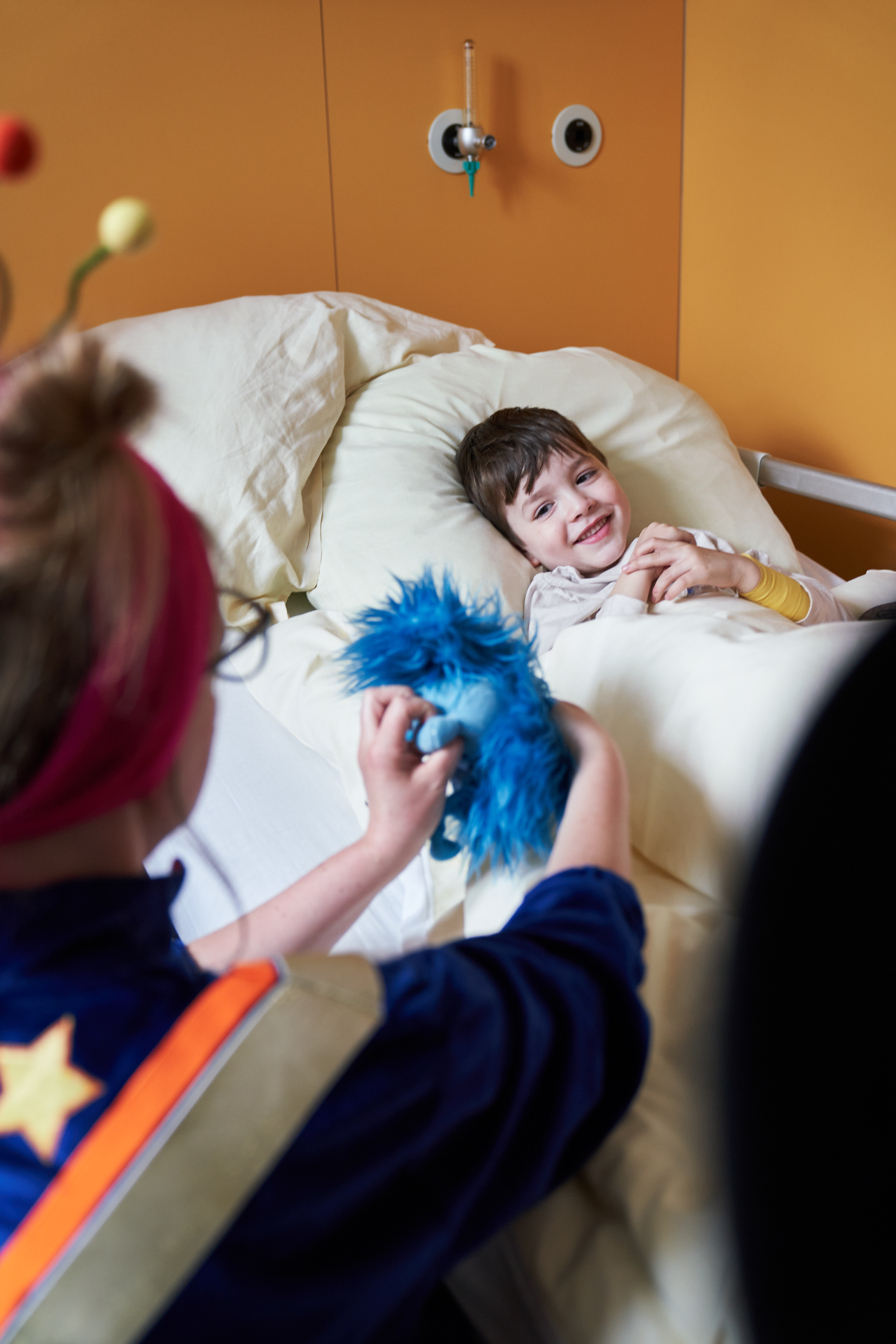 Der siebenjährige Junge ist schon länger im Kinderhospiz Berliner Herz, da er mehrfach behindert ist, besonders in seiner Gesichtsmuskulatur. Unsere Clowns kennen ihn schon gut und wissen, was ihm Freude bereitet. Jedes Mal, wenn Clown Pistazie mit ihrem schnarchenden Schweinchen vorbeikommt, bringt sie ihn zum Lachen! Eines Tages war Pistazie gemeinsam mit ihrem Clownkollegen Silver wieder im Berliner Herz unterwegs. Zunächst empfingen sie den Jungen im Musikraum empfangen und machten gemeinsam Musik – weniger klassische Lieder, sondern vielmehr Klänge und Reize: ein Regenmacher, tibetische Klangschale, alles, was sie finden konnten. So begann die multisensorische Show. Trotz Erkältung und Müdigkeit blühte der Junge auf, sobald das Schweinchen ins Spiel kam – und lachte immer wieder herzlich, wenn es seine Töne spielte. Seitdem begleitet das Schwein Bernie die Clowns bei jedem Besuch.