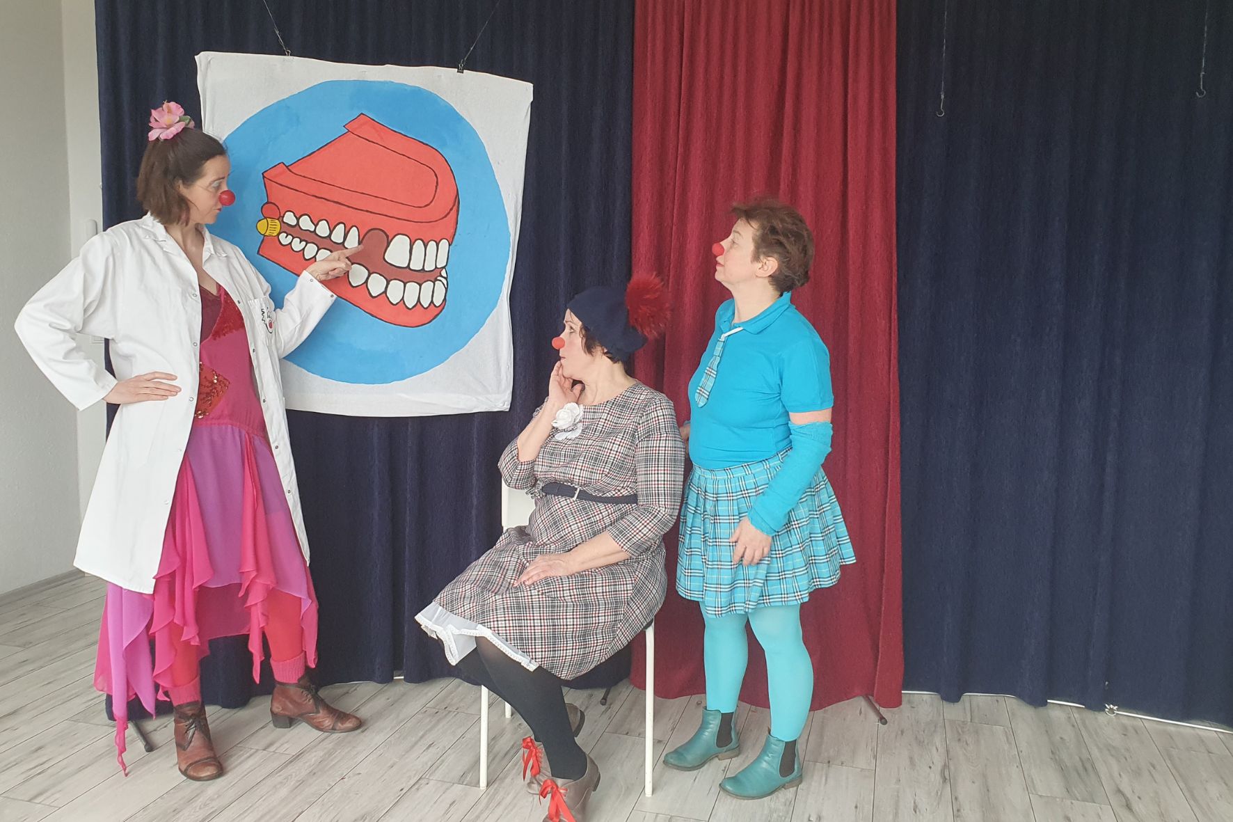 ROTE NASEN Clowns sind keine Pädagog:innen, sondern speziell ausgebildete Künstler:innen mit viel Erfahrung bei der Arbeit mit traumatisierten Menschen, insbesondere Kindern. In dem Clown-Theaterstück zum Thema „Zähne putzen“ ist eine Zahnärztin die Heldin und wird von drei Clowns bewundert. Als einer der Clowns Zahnschmerzen bekommt, versuchen die anderen die Arbeit der Zahnärztin zu imitieren, jedoch erfolglos. Die Zahnputzshow wird nun wöchentlich in Einrichtungen für Geflüchtete, derzeit in Berlin und Brandenburg, gespielt. Als künstlerische Ergänzung zu den Besuchen der Zahnärzt:innen soll das neue Format von ROTE NASEN zukünftig auch an Grundschulen im Bundesgebiet angeboten werden. Denn „Zähneputzen ist cool“ und gesund, finden nicht nur die Clowns. Prof. Dr. Felix Berger, der Direktor der Klinik für Angeborene Herzfehler und der Kinderkardiologie des Deutschen Herzzentrums der Charité - Universitätsmedizin Berlin, weiß als Experte, wie wichtig Zahnpflege für die allgemeine Gesundheit ist: „Eine gute Mundhygiene durch häufiges Zähneputzen und professionelle Zahnreinigungen scheint mit einem geringeren Risiko für Herzerkrankungen und Herzrhythmusstörungen einherzugehen. Die bisherige Forschung weist darauf hin, dass eine schlechte Mundhygiene dazu führt, dass Bakterien ins Blut gelangen und Entzündungen im Körper verursachen.“
