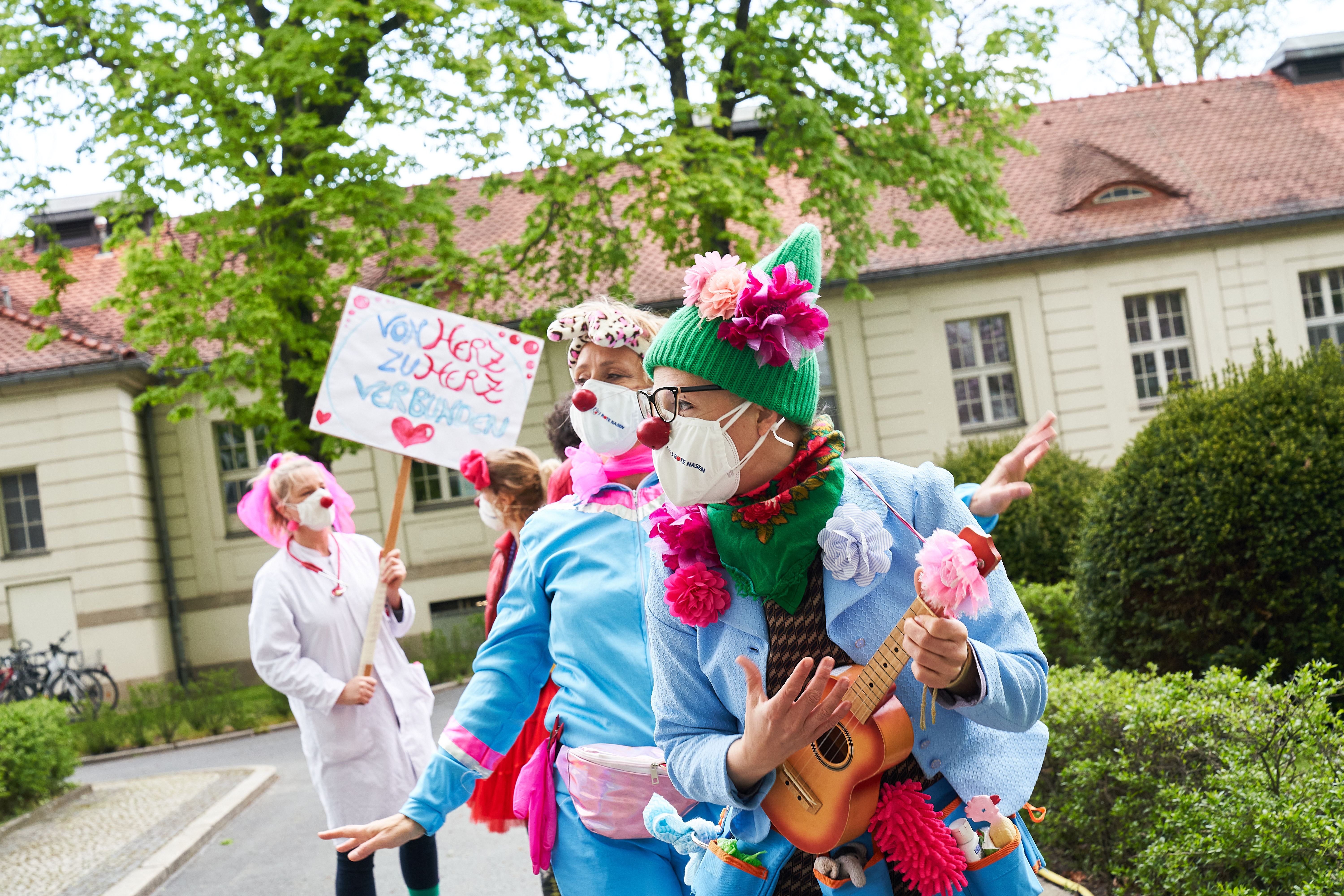 Fröhliche Nachrichten in ernsten Zeiten: Seit 15 Jahren bringen die Klinikclowns von ROTE NASEN wöchentlich Lachen und Leichtigkeit zu herzkranken Kindern im Deutschen Herzzentrum Berlin. Unter dem Motto „Von Herz zu Herz verbunden“ feierte ROTE NASEN Deutschland am 5.5.2021 das Jubiläum mit einer Clownparade im Außenbereich des DHZB und einer Tortenübergabe an Prof. Berger, Direktor der Klinik für angeborene Herzfehler.