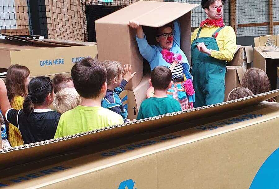 Enlarge photoSpielerische Traumaaufarbeitung: Gemeinsam mit den ROTE NASEN Clowns bauen Kinder aus Vicht ihre Wohnzimmer aus leeren Pappkartons nach.