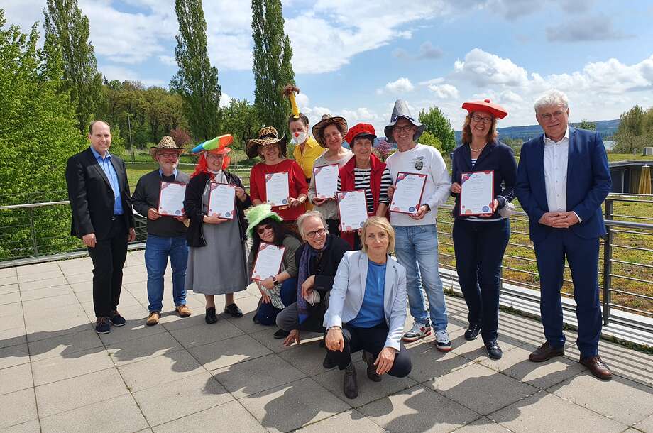 Hegne/Allensbach, 27.4.2022 // Mit Freude und Humor gegen Belastung in der Pflege: Mit einem Festakt im Schwimmbadsaal des Altenpflegeheims Maria Hilf des Kloster Hegne wurden am 26.4.2022 neun Pflege- und Betreuungskräfte mit einem Zertifikat als HumorAgent:innen ausgezeichnet. Neben den Humorcoaches Maria Gundolf und Reinhard Horstkotte vom Verein ROTE NASEN und Vertreter:innen der Pflegeinrichtung wurden die ersten HumorAgent:innen am Bodensee von Clown Kleo - in Gelb gekleidet - würdevoll gefeiert. Als Erinnerung an einen spielerischen Umgang mit stressigen Situationen im Pflegealltag bekam jeder Teilnehmende einen bunten Hut, den alle stolz bis zum Abschluss trugen. Claus Lehmann, Leiter der sozialen Dienste im Altenpflegeheim Maria Hilf und frisch gekürter HumorAgent freut sich das Gelernte im Alltag anwenden zu können: „Ich habe gelernt, über mich selbst lachen zu können, Missgeschicke als Geschenke anzusehen und vor allem den Mut zu haben mein Inneres Kind spielen zu lassen.“